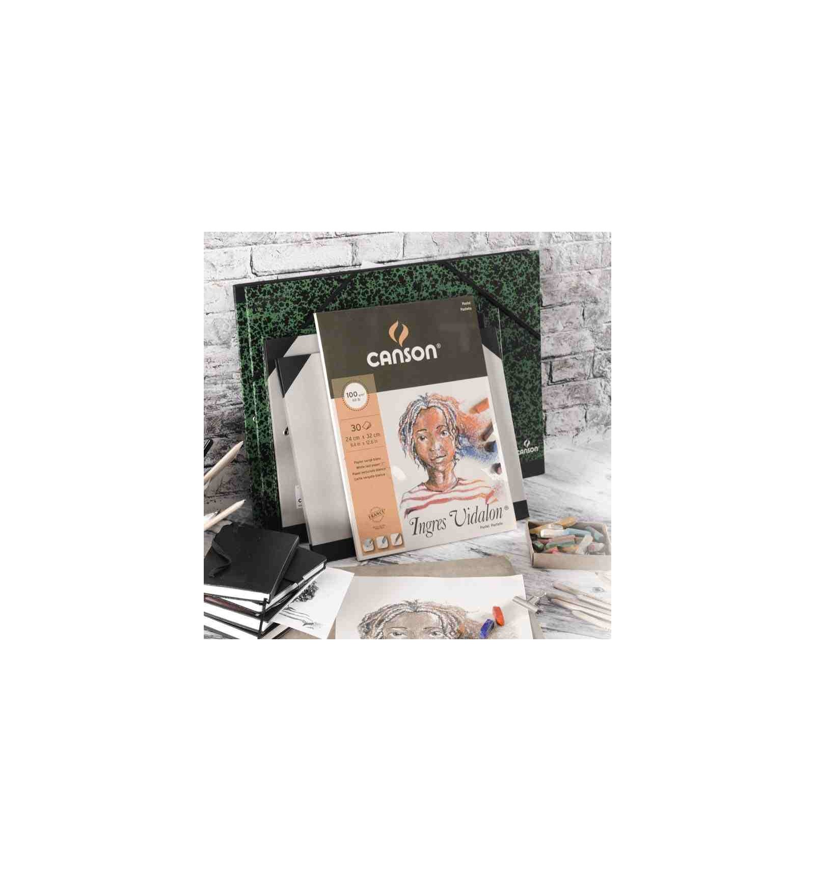 Composta per il 33% da cotone, la carta Canson® Ingres Vidalon® è una carta colorata da disegno, vergata, di qualità, con le stesse proprietà della carta Mi-Teintes®. Si presta perfettamente alle tecniche secche come pastello, matita, carboncino, sanguigna e anche edizione d'arte.