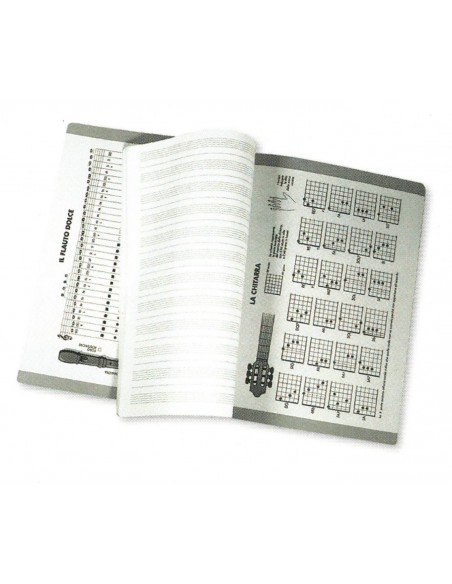 Album musica da 16 fogli pentagrammati (32 facciate) formato A4 ( 21x27,7 cm), rilegatura con punti metallici e copertina in cartoncino hard cover. Utilizzo a livello didattico e professionale per le materie musicali quali chitarra e flauto.