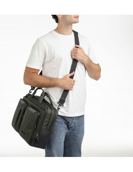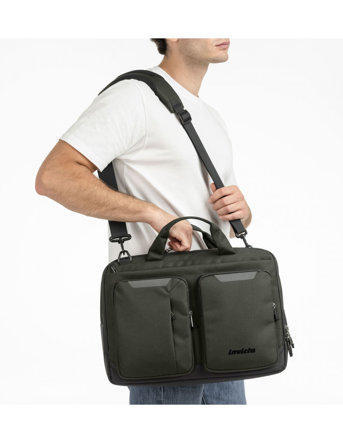 Tracolla doppio scomparto organizzata internamente con tasche rivestite in tessuto antigraffio ed imbottite. Schienale in Tessuto ed imbottito. Tracolla imbottita amovibile. Nastro per alloggiamento asta trolley. Gancio portachiavi. Inserti e logo Invicta riflettenti. Zip con finitura idrorepellente.