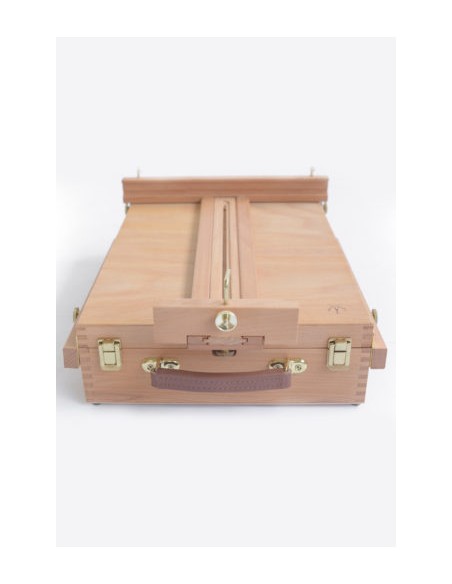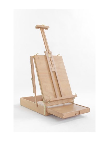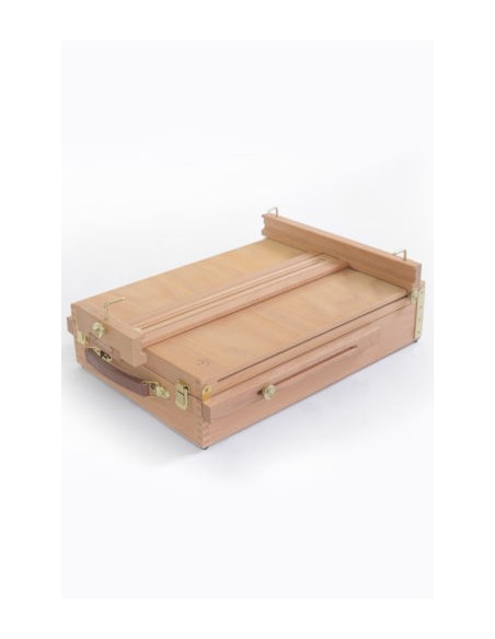 Il CC-31 di Cappelletto è la classica cassetta cavalletto da tavolo realizzata in faggio oliato con tavolozza in legno verniciato. Questo cavalletto da campagna è dotato di un pratico cassetto estraibile porta colori con interni suddivisi in scomparti rivestiti in metallo lavabile, sotto il cassetto sono presenti due profondi e capienti vani porta oggetti. Il porta-tele è ad inclinazione variabile e può essere alzato o abbassato per consentire l’eliminazione dei riflessi di luce, può supportare tele fino a 2,5 cm di spessore e 85 cm di altezza.