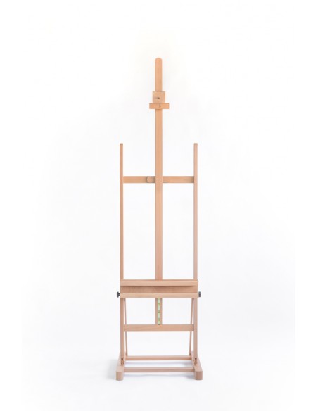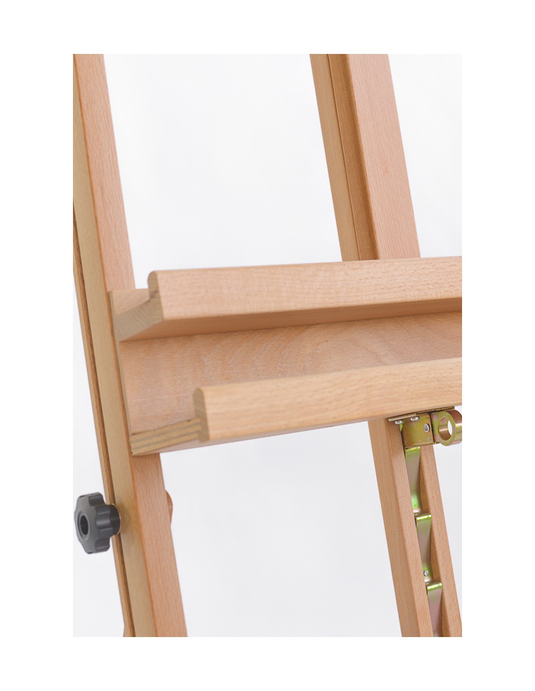 Il CS-100 BIS di Cappelletto è un cavalletto da studio base con mensola, in legno di faggio oliato molto leggero e maneggevole di fascia economica. Rispetto al CS-100, il CS-100 BIS è dotato di una doppia mensola, la prima supporta la tela mentre la seconda può essere utilizzata come punto d’appoggio per pennelli, colori, spatole, matite da disegno, pennarelli, attrezzatura varia. La distanza della mensola da terra è variabile fra un minimo di 40 cm e un massimo di 115 cm. Le regolazioni dell’inclinazione del cavalletto avvengono tramite il fissaggio dato da pomelli ergonomici ad alta scorrevolezza in tecnopolimero nero. La regolazione dell’altezza (varia da una minima di 170 cm a una massima di 245 cm) avviene tramite il sistema di cremagliera metallico fissato da un cricchetto. Il CS-100 BIS viene fornito con la predisposizione per l’applicazione degli accessori opzionali Cappelletto consigliati (mensole ET-1, ET-2 e cassette portacolori CA-4 e CA-6) applicabili con un semplice sistema ad incastro senza viti. Quando non viene utilizzato, questo cavalletto “salva-spazio” ha un ingombro minimo in quanto con un solo facile movimento è possibile ripiegarlo completamente. Il cavalletto da studio base con mensola è pensato appositamente per soddisfare l’esigenza di studi di pittura e per permettere di esprimere l’arte anche in spazi ridotti. Rispetto ad altri prodotti della stessa gamma, la leggerezza lo rende più adatto ad essere spostato all’interno di strutture come alberghi, ristoranti, bar, musei, gallerie o edifici dove esporre e mettere in risalto riviste, libri, cataloghi, menù, lavagne. Nell’uso da esterno per l’esposizione di lavagne, menù, cartelloni pubblicitari, in situazioni di vento, il CS-100 BIS ha la caratteristica di essere più stabile rispetto ai cavalletti a lira per la sua conformazione a base è quadrata, pesante e con il baricentro più basso..