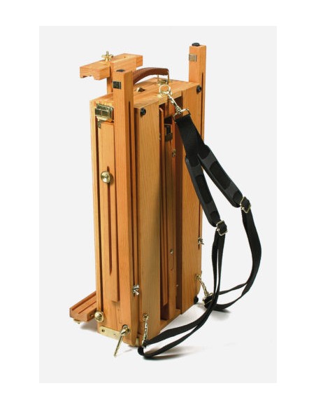 Il CC-32 di Cappelletto è una cassetta cavalletto piccola da terra, realizzata in legno di faggio oliato con tavolozza in legno verniciato. Questo cavalletto da campagna è dotato di un pratico cassetto estraibile porta colori. Gli interni sono suddivisi in scomparti rivestiti in metallo lavabile. Sotto il cassetto sono presenti due profondi e capienti vani porta oggetti. Il porta-tele è ad inclinazione variabile e può essere alzato o abbassato per consentire l’eliminazione dei riflessi di luce. Può supportare tele fino a 2,5 cm di spessore e 85 cm di altezza. I tre punti d’appoggio, dotati di puntali in gomma antiscivolo, sono regolabili per permettere una maggiore aderenza e stabilità al terreno. La cassetta cavalletto portatile a zaino CC-32, oltre ad una comoda maniglia in ecopelle lavorata da artigiani locali, è dotata di bretelle a zaino, in fettuccia di cotone, con comodi spallacci ergonomici per un confortevole trasporto in spalla. La larghezza della cassetta è dimensionata per permettere una migliore aderenza alla schiena dell’utilizzatore. Quando non si utilizza, la CC-32 si ripiega su se stessa con un solo facile movimento, fino ad occupare un minimo ingombro. E’ un vero prodotto “salva-spazio”. Consente al professionista di avere sempre tutto l’occorrente a portata di mano: dalla tela ai pennelli, pigmenti, colori, matite, carboncini, gessetti, attrezzi e strumenti del mestiere, in qualsiasi luogo esso venga trasportato. La cassetta cavalletto piccola è ideale per la pittura en plain air in campagna, al parco, lungo le vie cittadine. Questa cassetta cavalletto è apprezzata dagli artisti di strada e dai ritrattisti per la sua leggerezza, la forma poco ingombrante e la praticità nel trasporto. La sua versatilità gli permette di essere utilizzato anche come cavalletto da tavolo.