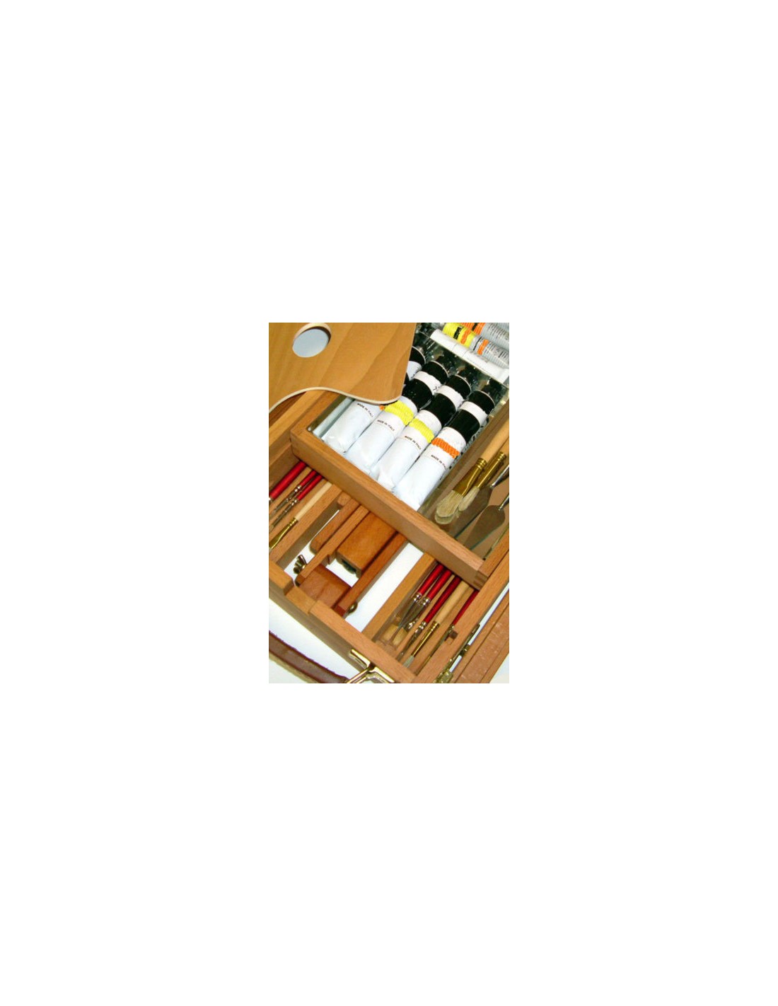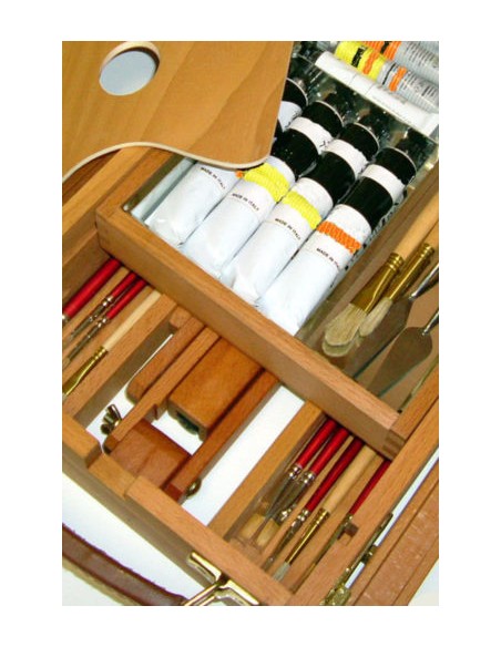Il CC-32 di Cappelletto è una cassetta cavalletto piccola da terra, realizzata in legno di faggio oliato con tavolozza in legno verniciato. Questo cavalletto da campagna è dotato di un pratico cassetto estraibile porta colori. Gli interni sono suddivisi in scomparti rivestiti in metallo lavabile.
