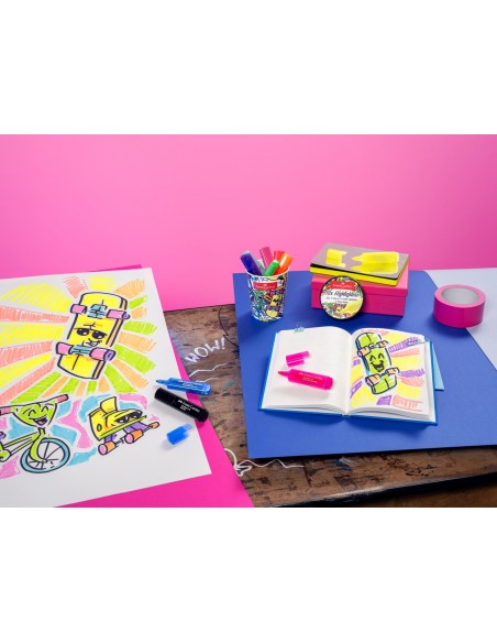 Evidenziatori super luminosi in caratteristico barattolo di cartoncino. La punta speciale può marcare in tre larghezze di tratto, Inchiostro a base d'acqua utilizzabili su tutti i supporti in carta o cartoncino.