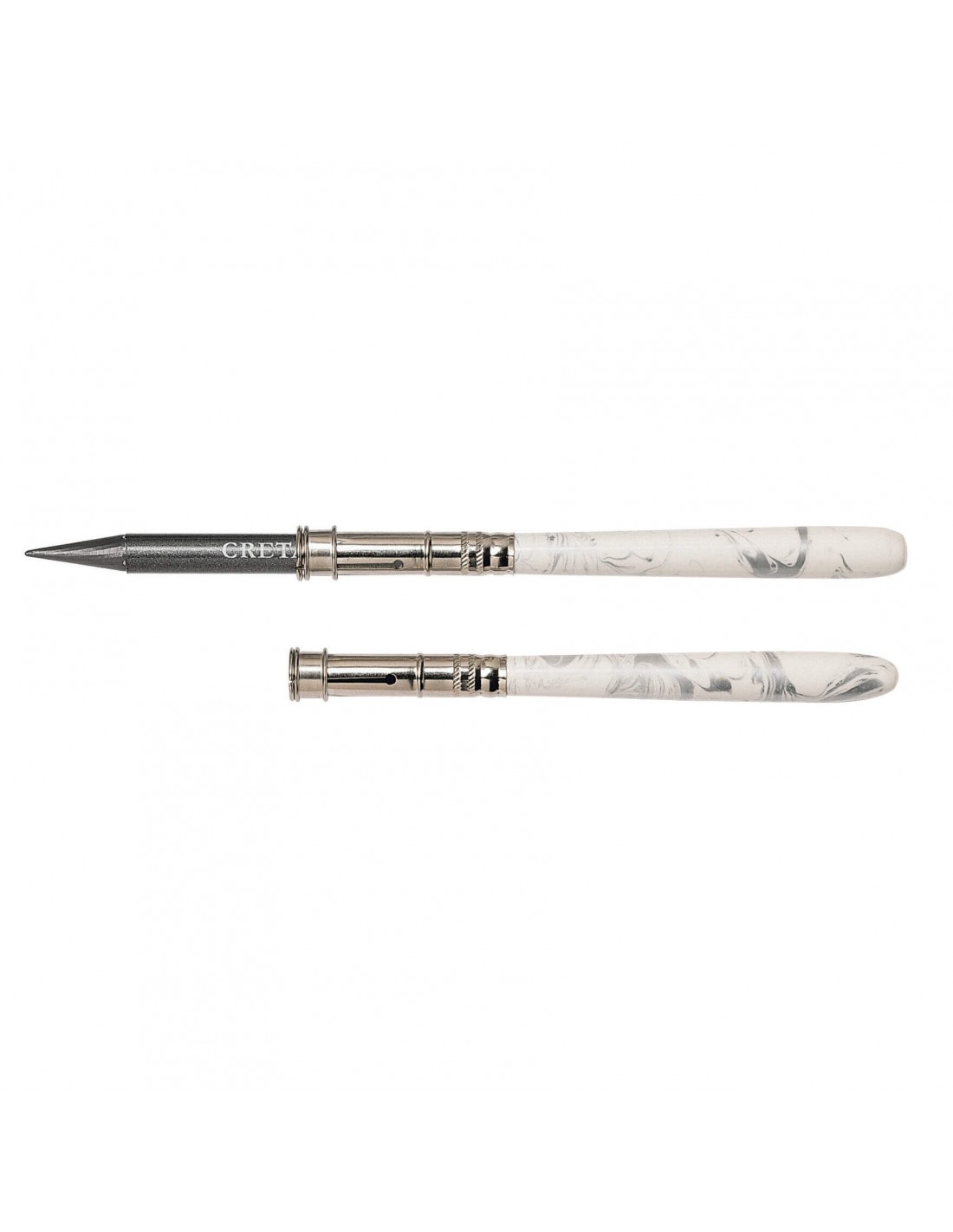 Estendi o rifinisci la tua matita o mina in grafite preferita, con il sofisticato estensore in un fusto bianco-argento con effetto marmorizzato a mano e con un anello di serraggio in metallo regolabile.