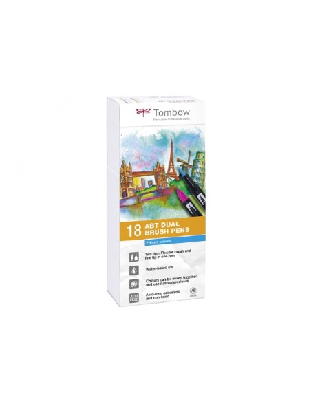 Set 18 pennarelli Dual Brush Tombow colori primari. Due punte in fibra: sottile per tracciare linee precise, a pennello per colorare ampi spazi. Inchiostro a base d'acqua, atossico, inodore, acid free.