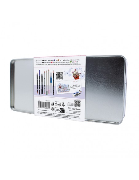 Il kit contiene una selezione di prodotti Tombow di alta qualità per disegnare ovunque tu sia. La scatola di metallo fa si che i tuoi strumenti da disegno non si rovinino o si rompano. La confezione contiene: 1 matita MONO100 1H + 1 gomma MONO XS + 1 marker Fudenosuke nero soft + 2 Dual Brush (565-947) + 1 Waterbrush punta piatta + 2 matite colorate IROJITEN + 1 Dual Brush PRO (845) + 1 guida step-by-step dell'artista Carla Kamphuis (EN-DE-ES-FR-IT-NL)
