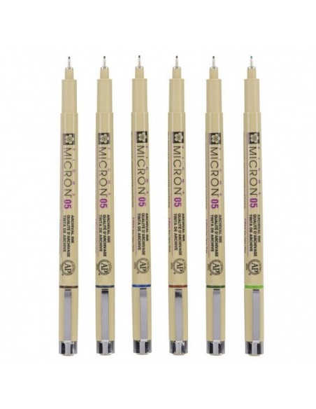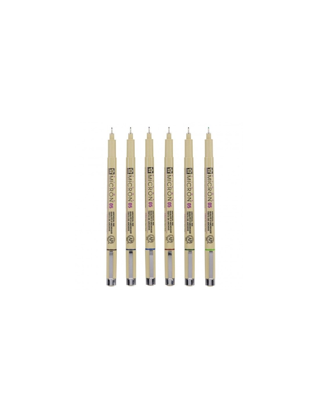 Set di 6 penne Fineliner Pigma Micron con punta 05 (0,45mm) Sakura nelle colorazioni di Blu Scuro - Blu Royal - Seppia - Bordeaux - Verde Scuro - Verde Chiaro. Sono particolarmente indicate per disegni, scrittura e illustrazioni, sia in campo tecnico, sia artistico. L'impareggiabile inchiostro Sakura Pigma non macchia l'altro lato del foglio di lavoro, è permanente, resiste all'acqua, anti-sbiadimento, ad asciugatura rapida e a pH neutro resistente agli agenti chimici.