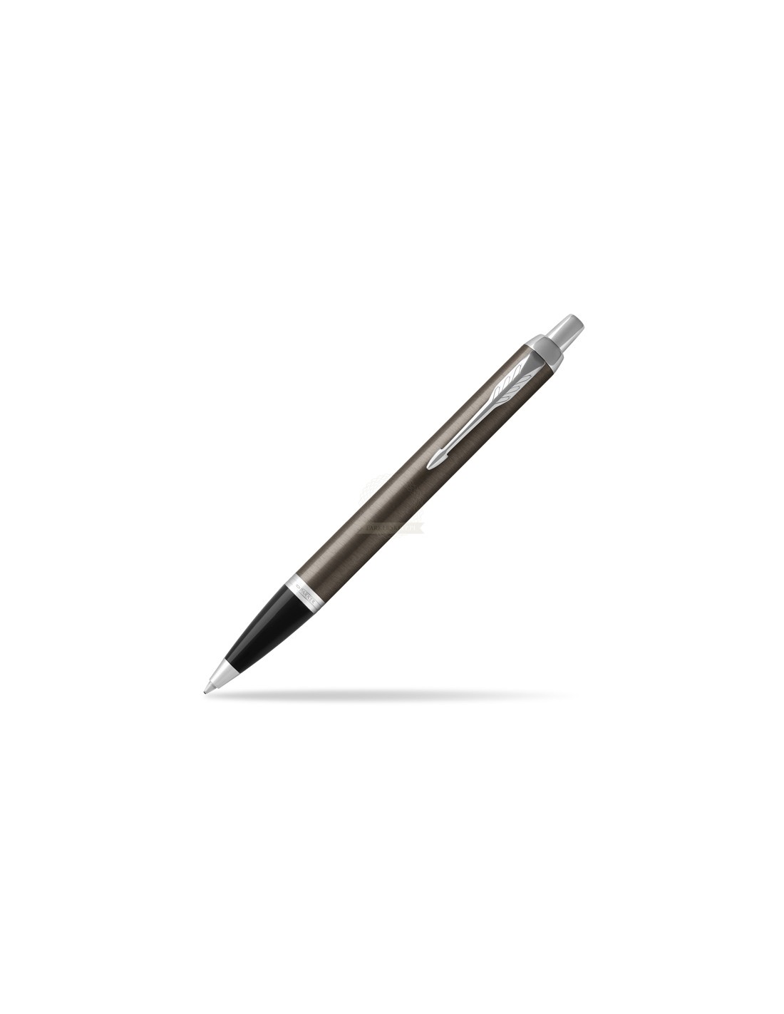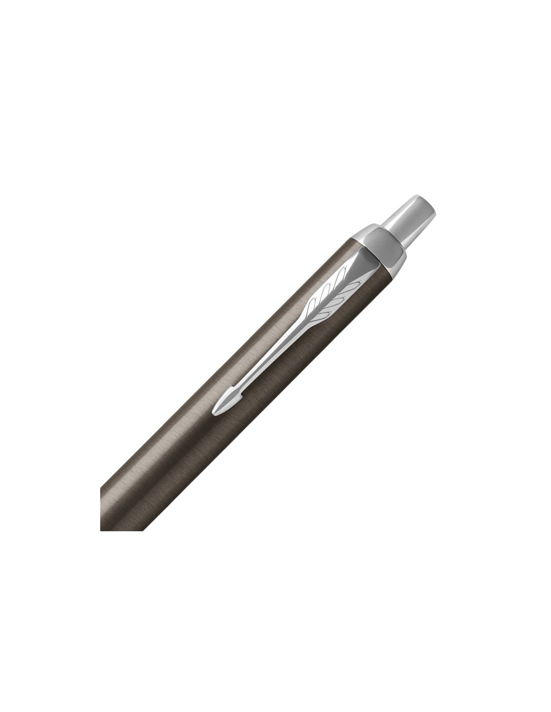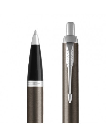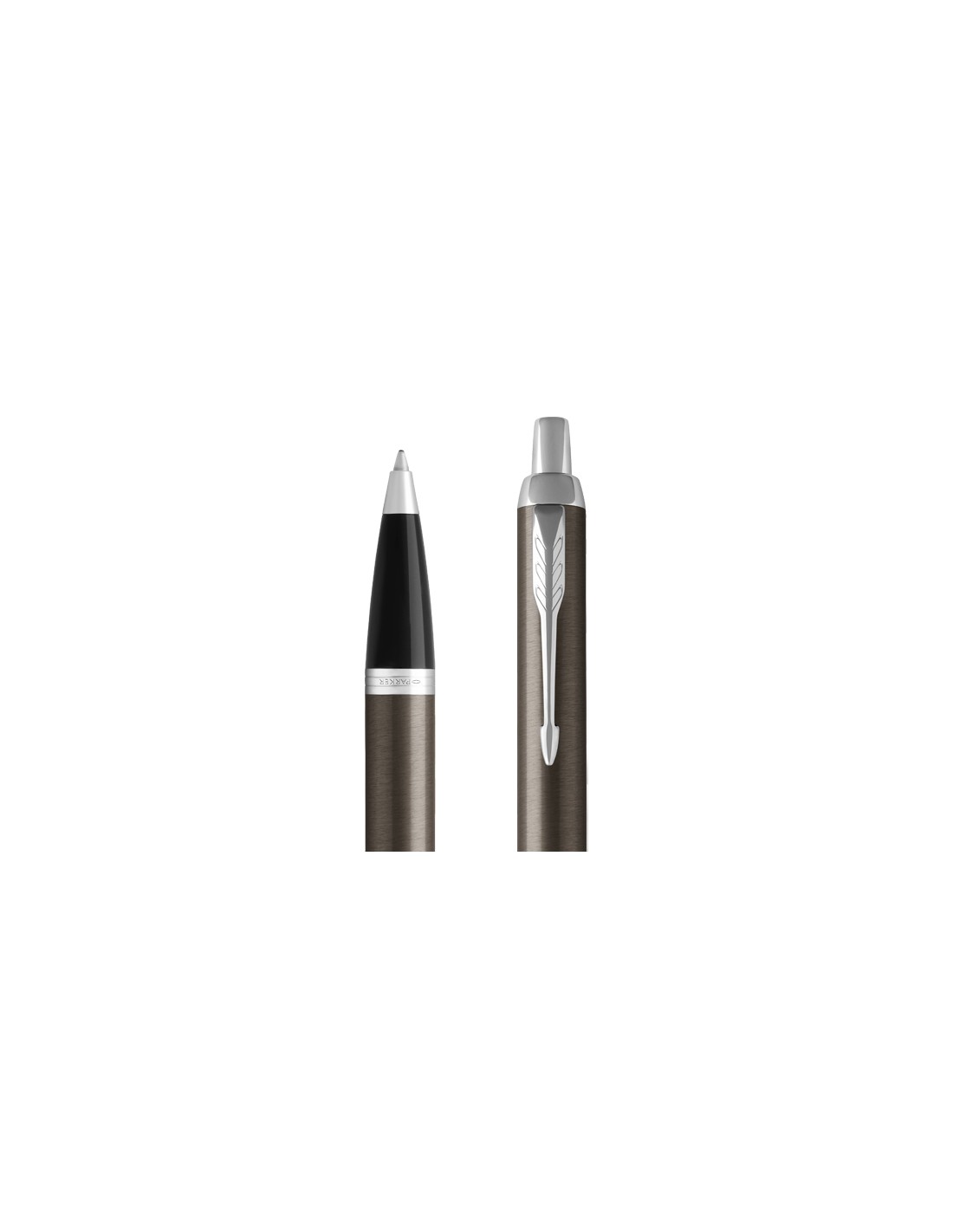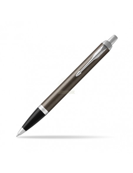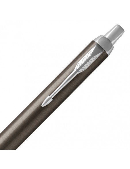 La penna a sfera Parker IM Dark Espresso Lacque è icona di eleganza moderna dal design unico. Corpo realizzato in alluminio color grigio antracite spazzolato con eleganti finiture in acciaio e impugnatura nera lucida, impreziosito con il caratteristico clip in acciaio con punta a freccia. Chiusura a scatto.