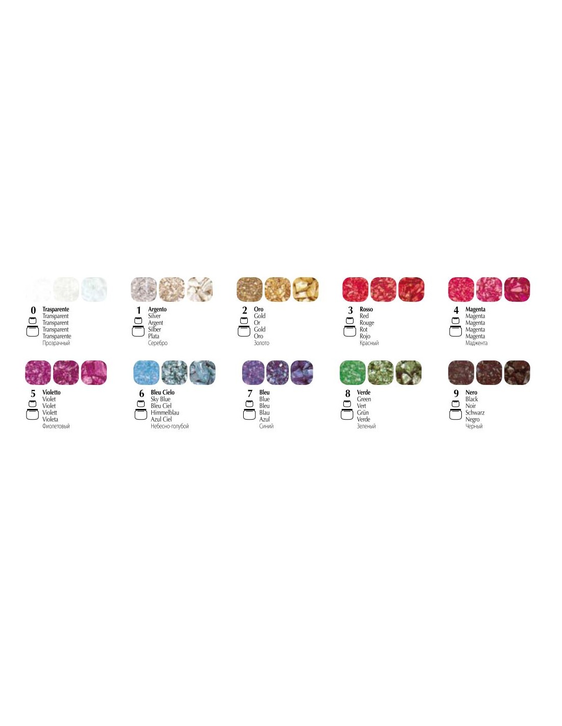 Trovano il loro impiego su qualunque oggetto che vogliamo rendere brillante e scintillante. A seconda del supporto possono essere miscelati ai gel del Vetro Color, oppure applicati con la colla o con la pasta collante o ancora distribuiti sui colori ancora freschi.