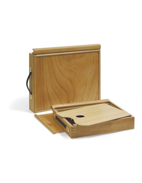Apertura del coperchio a scorrimento. Comodamente trasportabili grazie ad una maniglia realizzata in acciaio armonico ricoperto di vinile nero. Le parti metalliche sono avvitate a mano. Prodotto indispensabile per la pittura "En plein air", utilissime nei laboratori di pittura per riporre ordinatamente colori, vernici, pennelli ed attrezzatura varia come spatole, scodellini, straccetti, spugnette. Cassette adatte agli artisti di ogni livello. Prodotta in Italia.