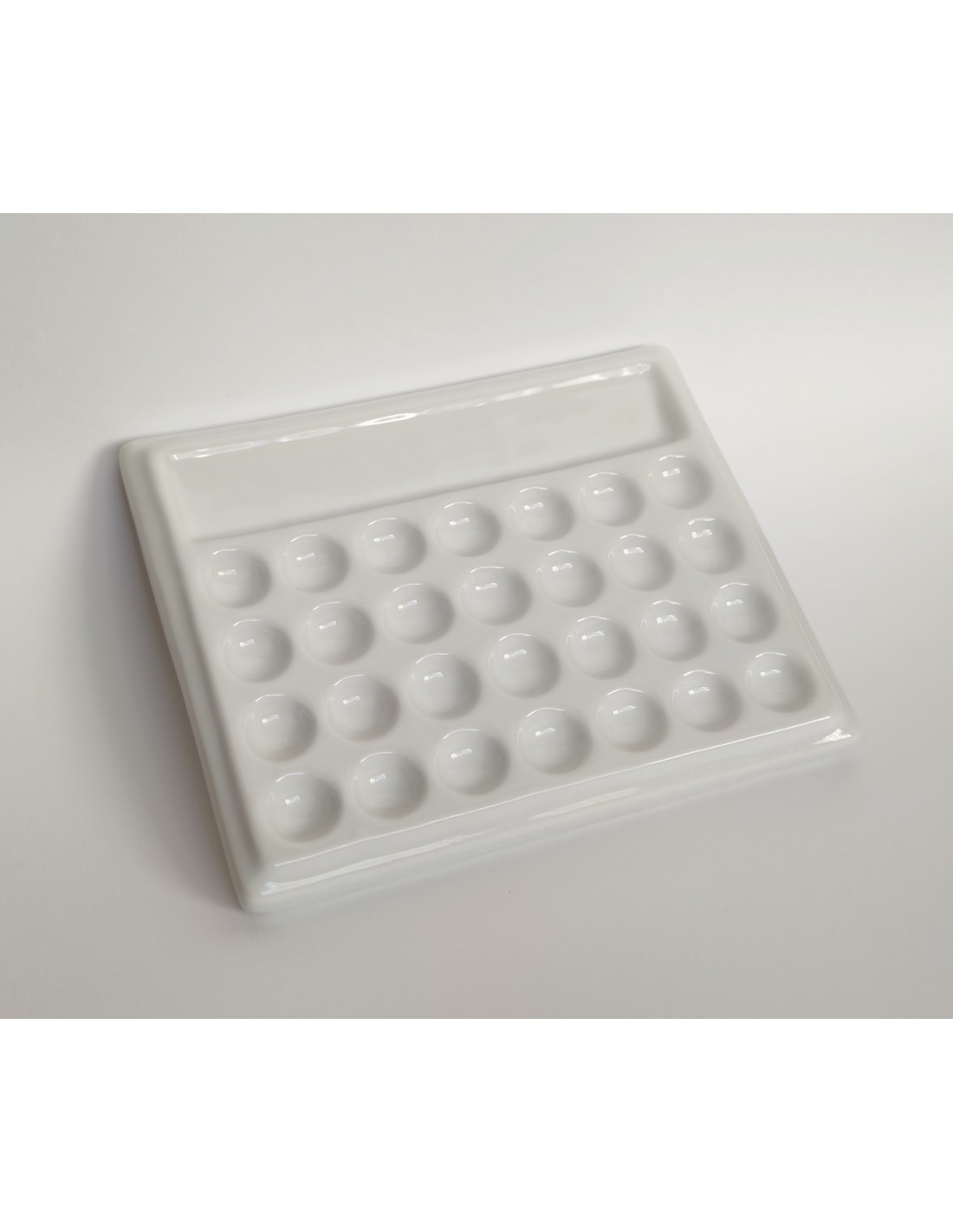 Tavolozza in porcellana rettangolare con 28 vaschette tonde. Prodotto di ottima qualità e manifattura è resistente ad urti, ma necessita utilizzare cautela evitando cadute accidentali. Ideale per acquerello e tutte le tecniche di pittura umide.