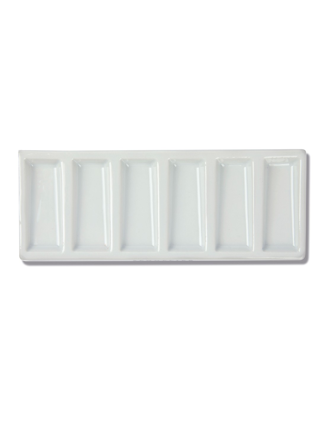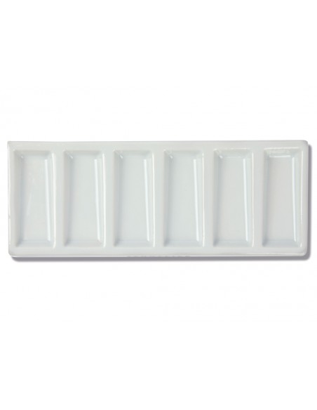 Tavolozza rettangolare in ceramica smaltata dimensione 19,5 x 7,8 centimetri suddivisa in sei cellette per suddividere i colori. Molto utile e pratica per tecniche umide quali acquerello e china.