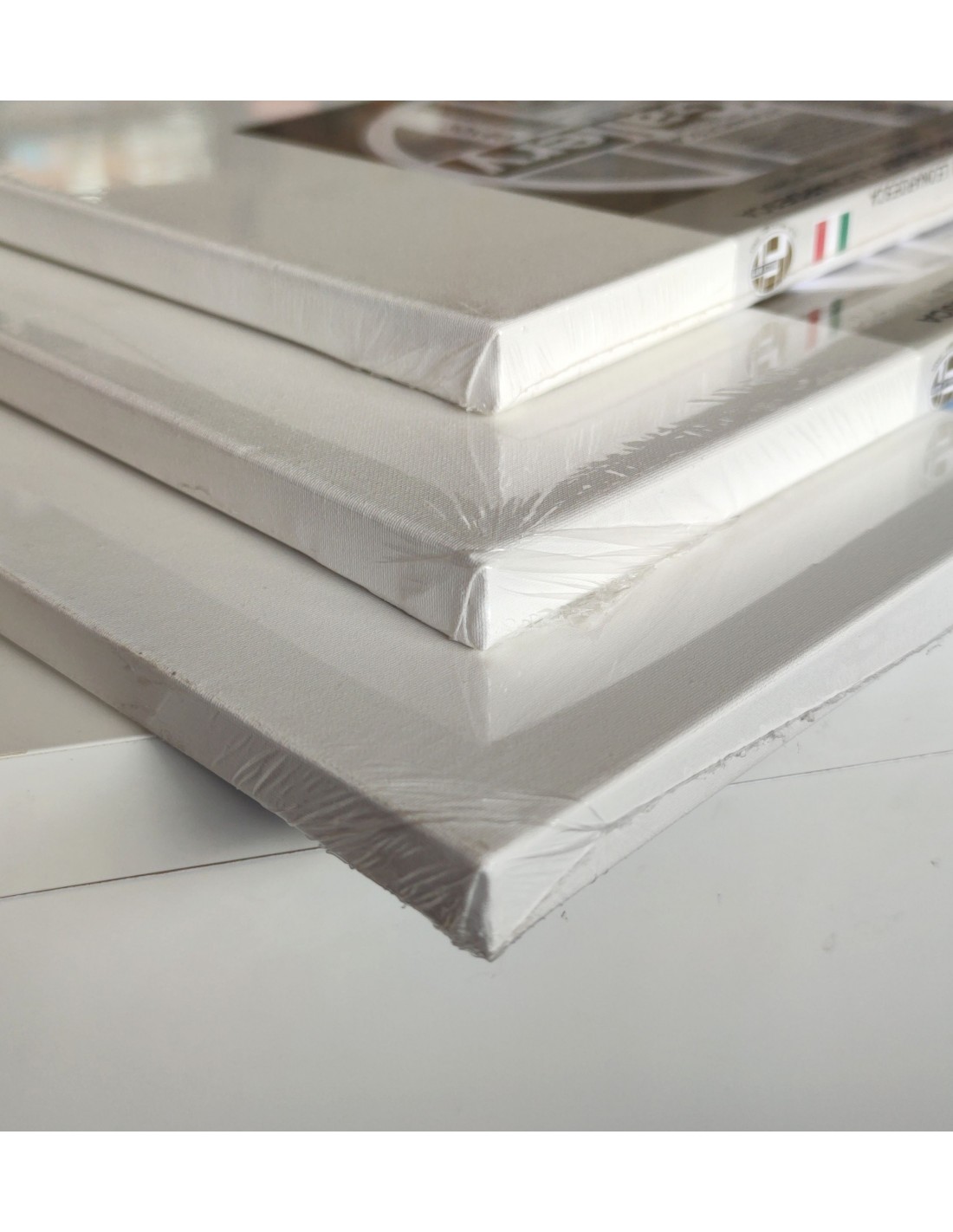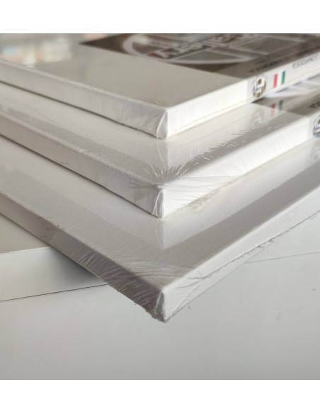 Telaio telato professionale di alta qualità realizzato in cotone a grana fine con preparazione a gesso con stesura omogenea e priva di discontinuità: