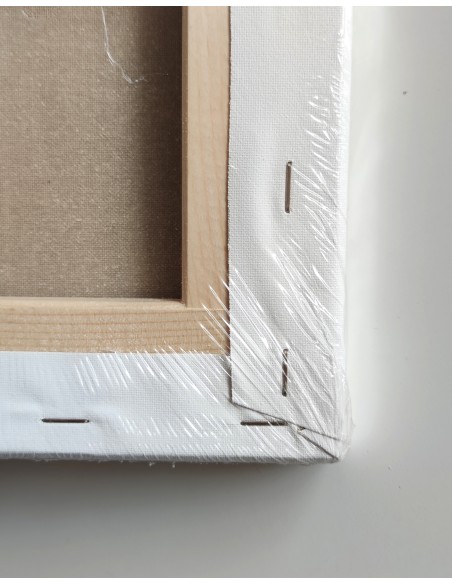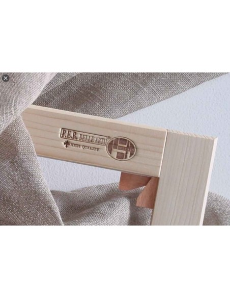 I telai sono interamente realizzati in pregiato abete rosso europeo essiccato al giusto grado di umidità per garantire una stabilità ottimale. I listelli sono uniti tra loro con un angolo di 45° sul lato di appoggio della tela e un angolo di 90° sul retro, assicurando una giusta tensione e una messa in squadra perfetta. Cunei in legno sagomati a becco con angolo di penetrazione molto acuto.