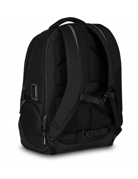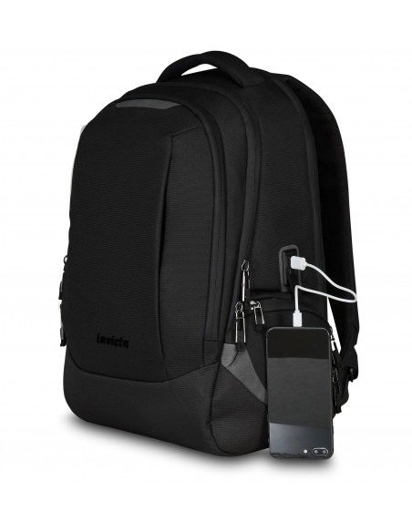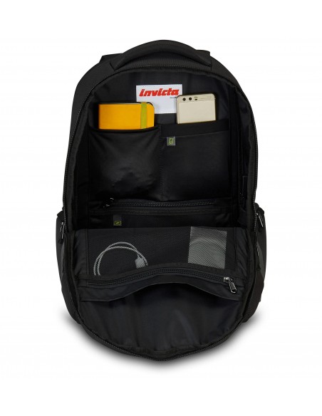 Zaino doppio scomparto con fondo rinforzato. Cinghia a vita e nastro torace regolabili e amovibili. Nastro per alloggiamento asta trolley. Inserti e logo Invicta riflettenti. Zip con finitura idrorepellente. Tira zip in metallo con sistema di sicurezza. Porta USB. Maniglia superiore imbottita.